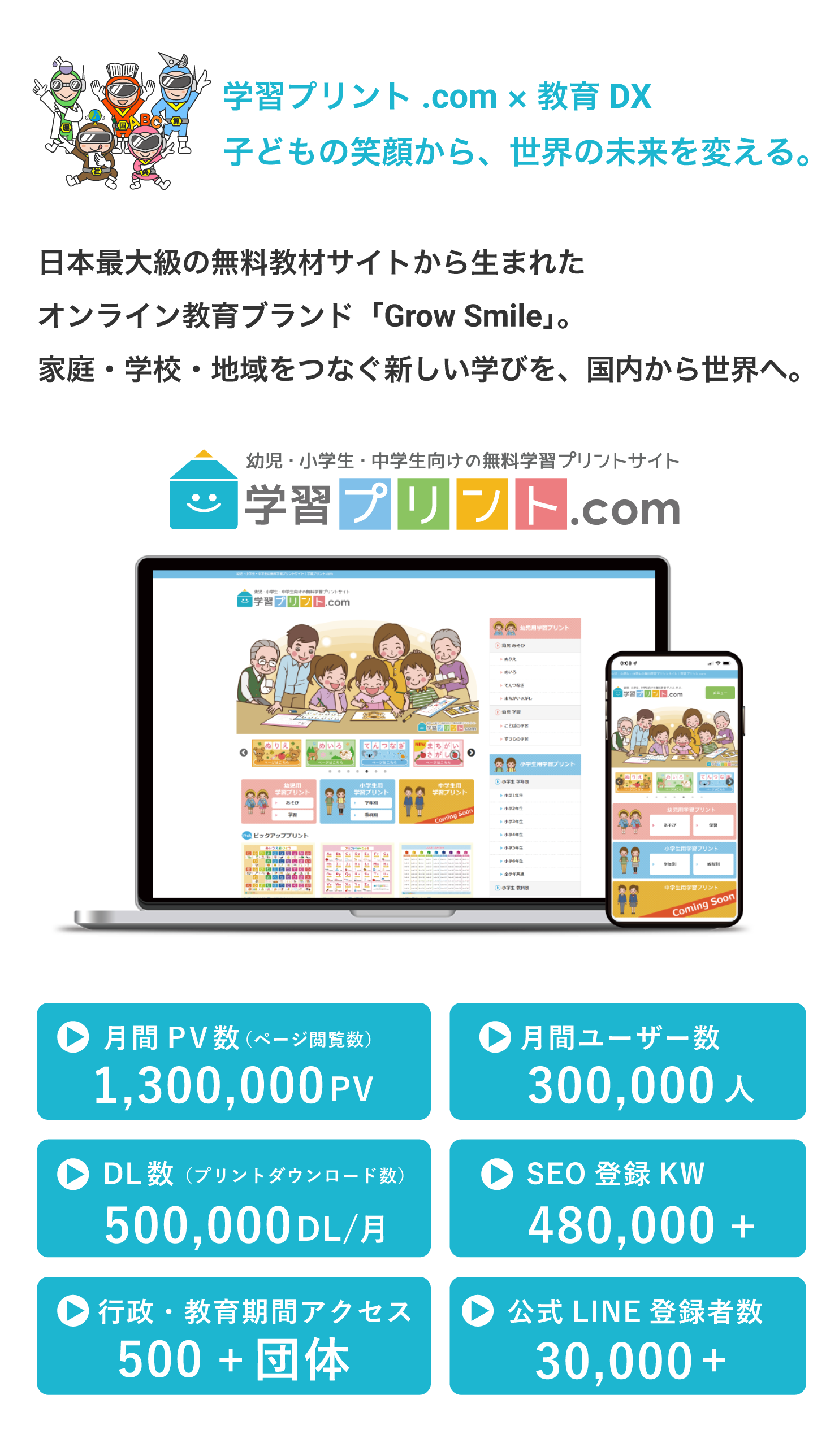 株式会社GROW SMILEは、「教育」という責任ある仕事を通じて、子供たちが生まれもって備えている「生きる力」を育み、自ら学ぶ姿勢や意欲の一助となることによって、子供達が夢や希望を持つことが出来る豊かな社会づくりへの貢献が出来るよう、日々業務に取り組んでおります。